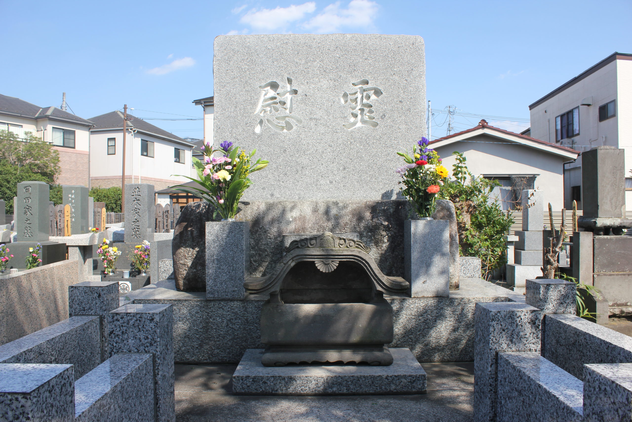 石碑は御影石。「慰霊」の文字は鯨岡兵輔元理事長によるものです。