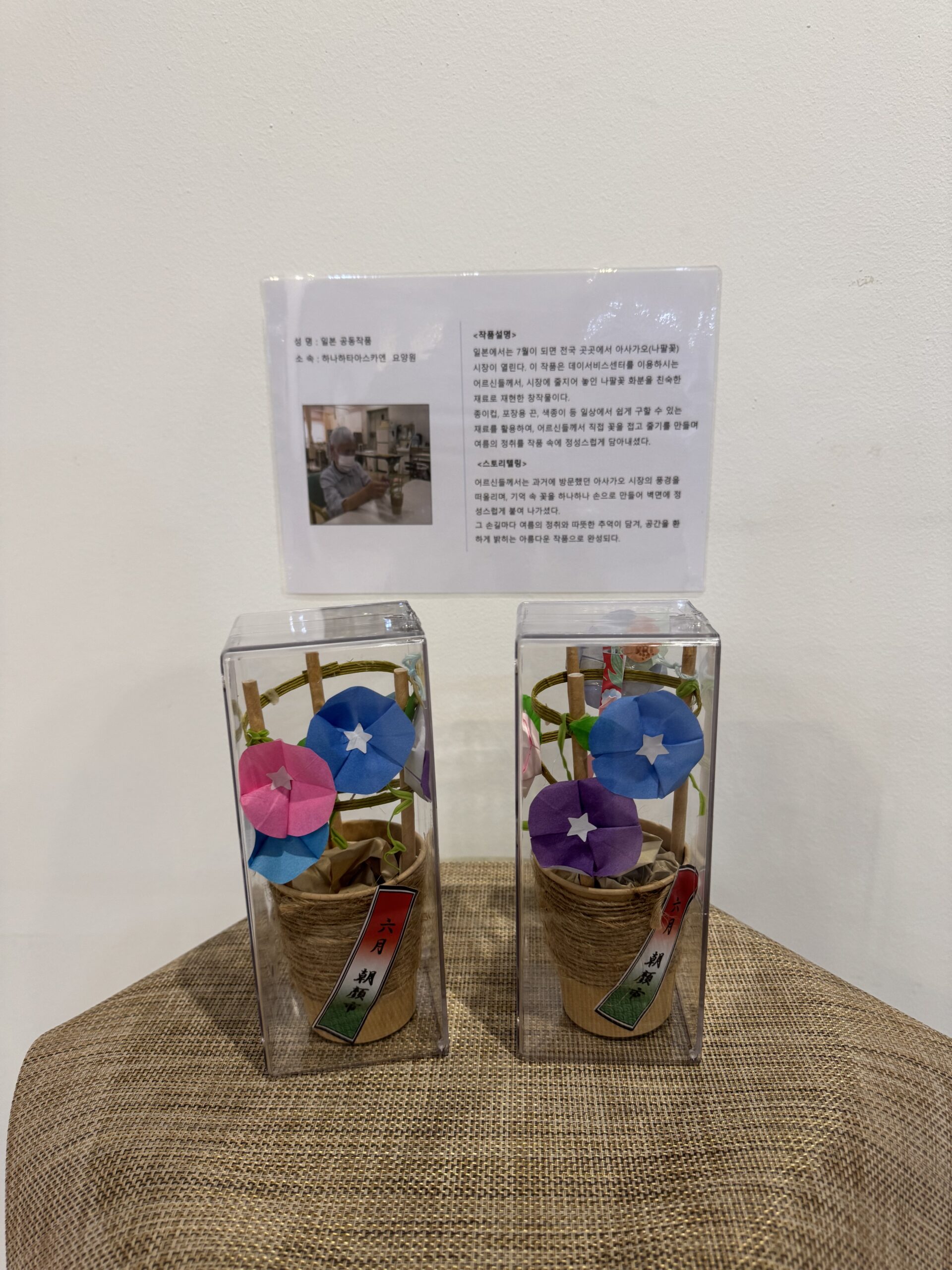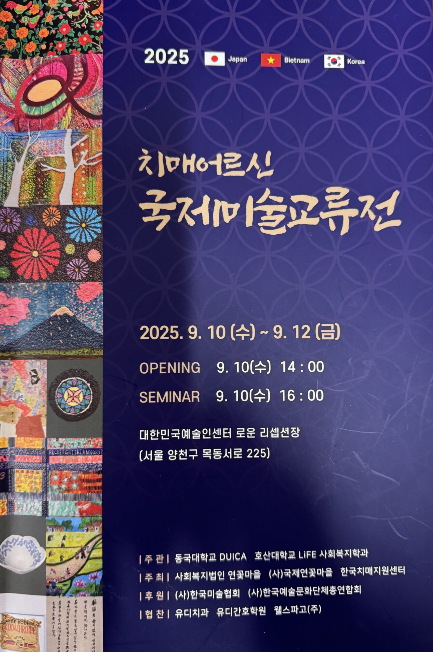 日本・ベトナム・韓国の認知症高齢者による美術作品を持ち寄り、国境や文化を越えて芸術的な連携を深めることを目的としたこのイベント。当法人は特養やデイサービスのご利用者が作り上げた作品を出品しました(さすがに大きな作品は韓国に運べなかったため、プログラム内で紹介される形となりました)。