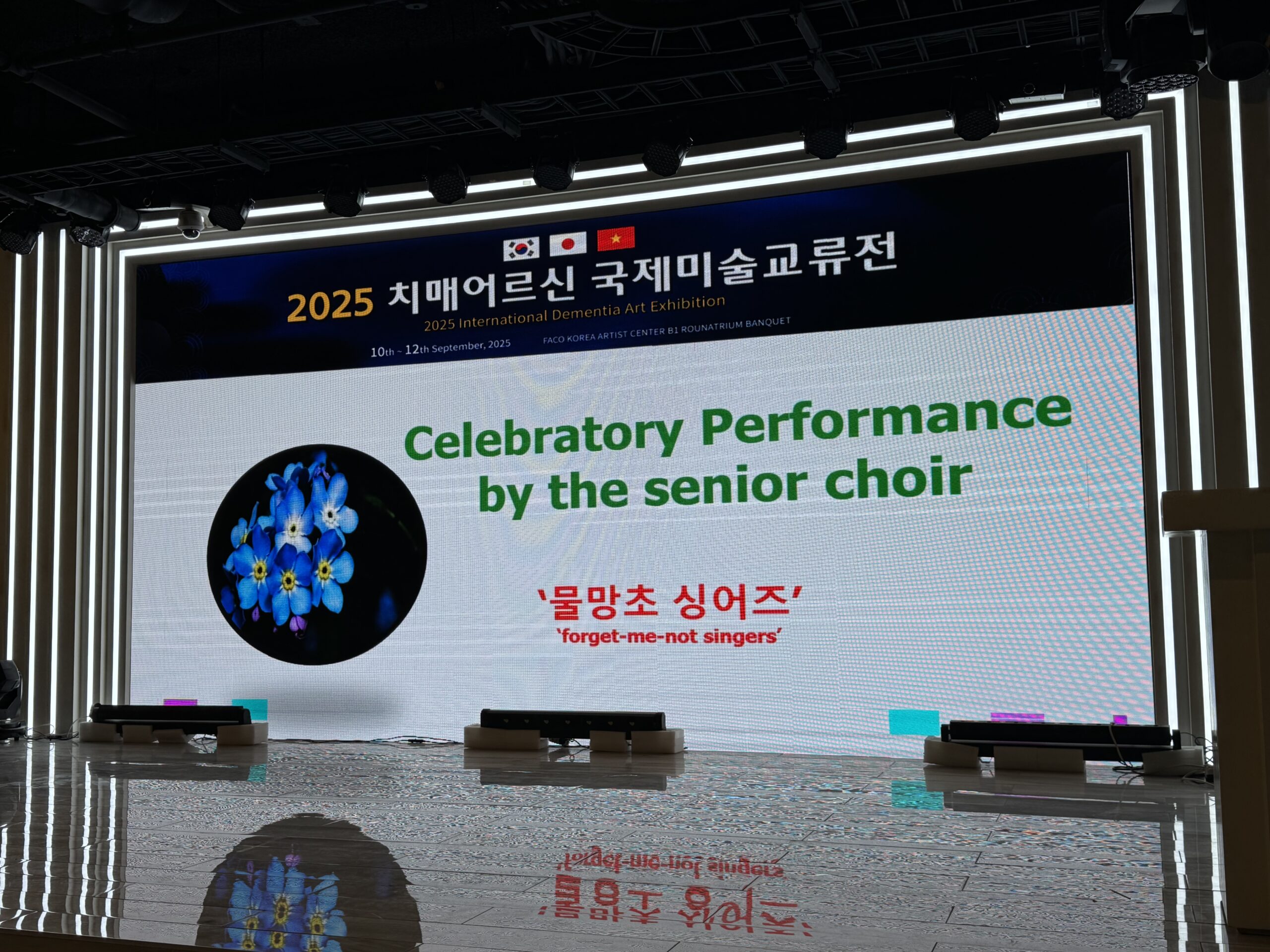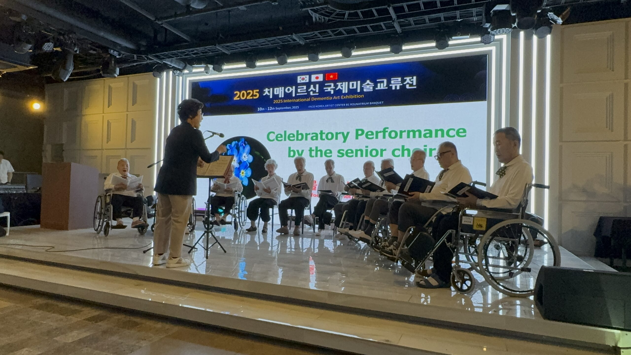 交流展では、「ウォーターパークシンガーズ」という認知症高齢者で構成された合唱団による公演や、各国代表による基調講演が行われました。合唱団は2年間にわたる練習の成果を披露し、指揮者の先生のもとで素敵な歌声を聴かせてくれました。