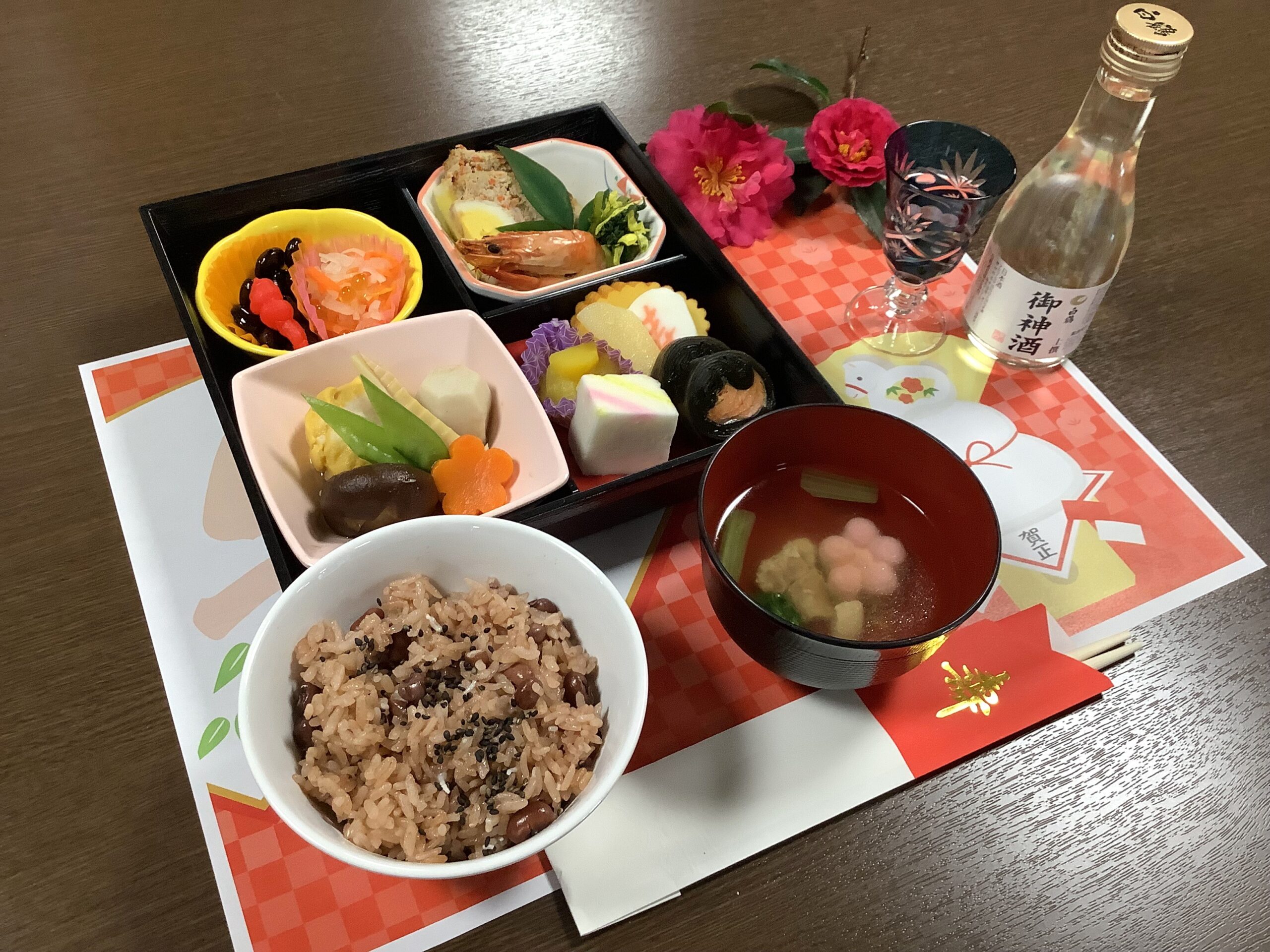 重箱を開けるとご利用者から「わ~すごいね。豪華!」「おいしそう!」といった声が聞かれ、日本酒や甘酒で新年を祝い、乾杯!