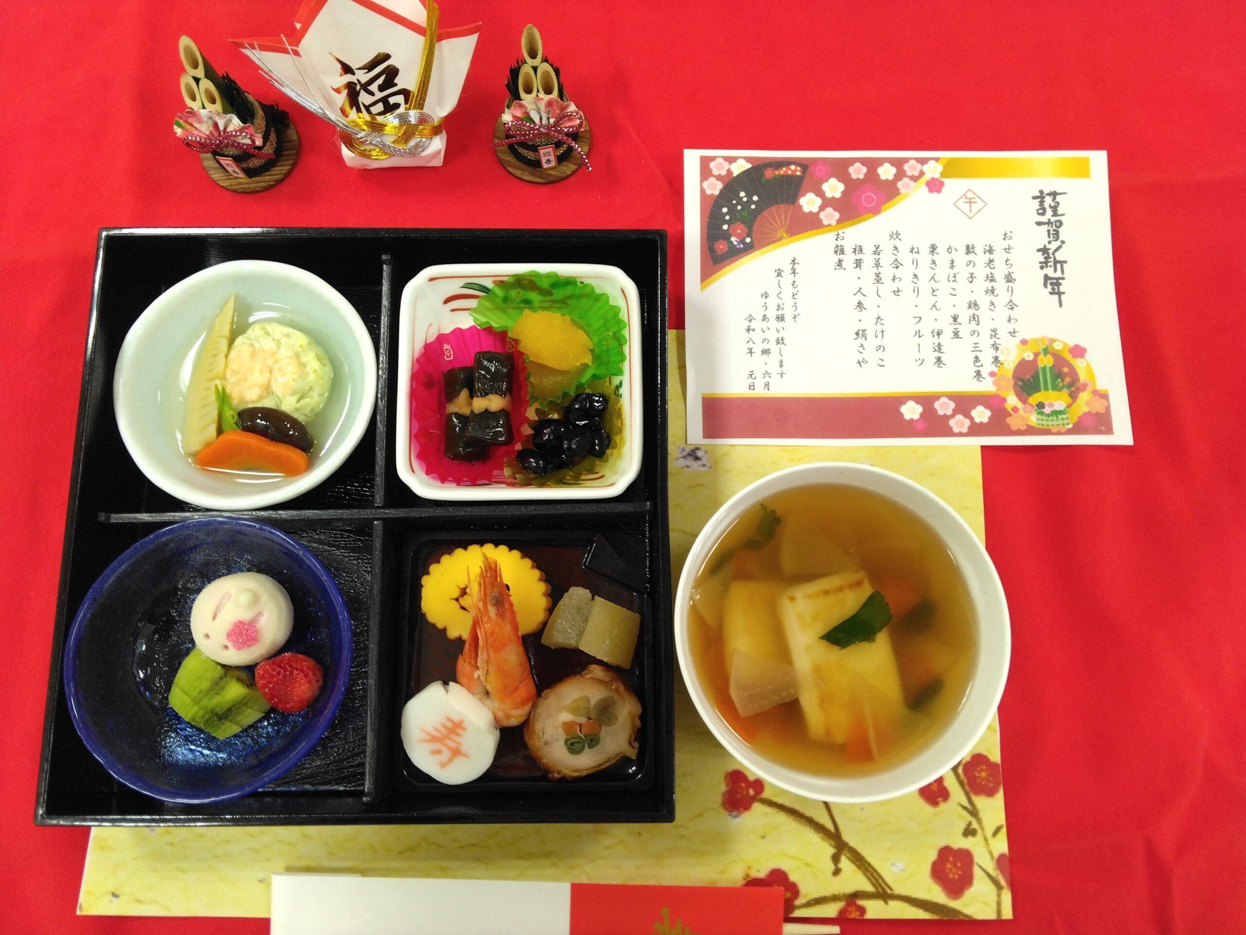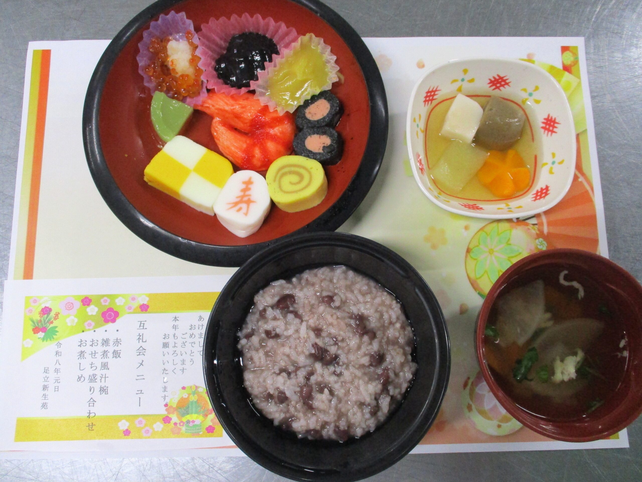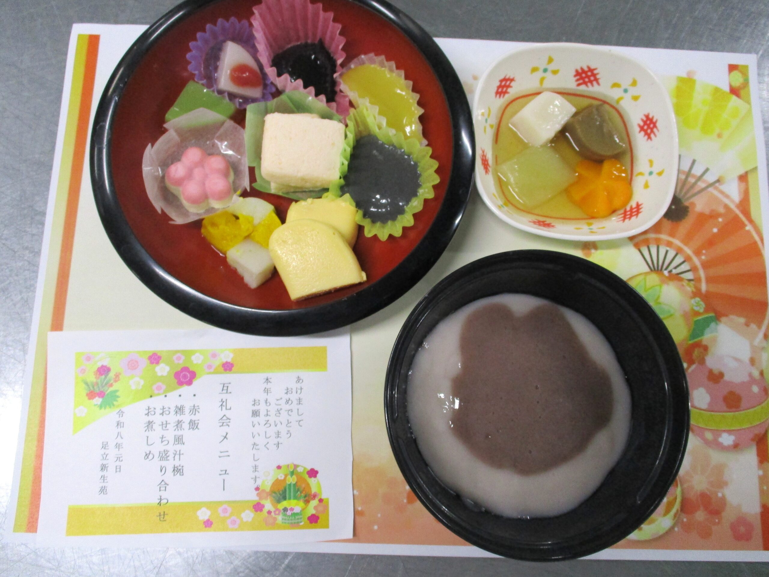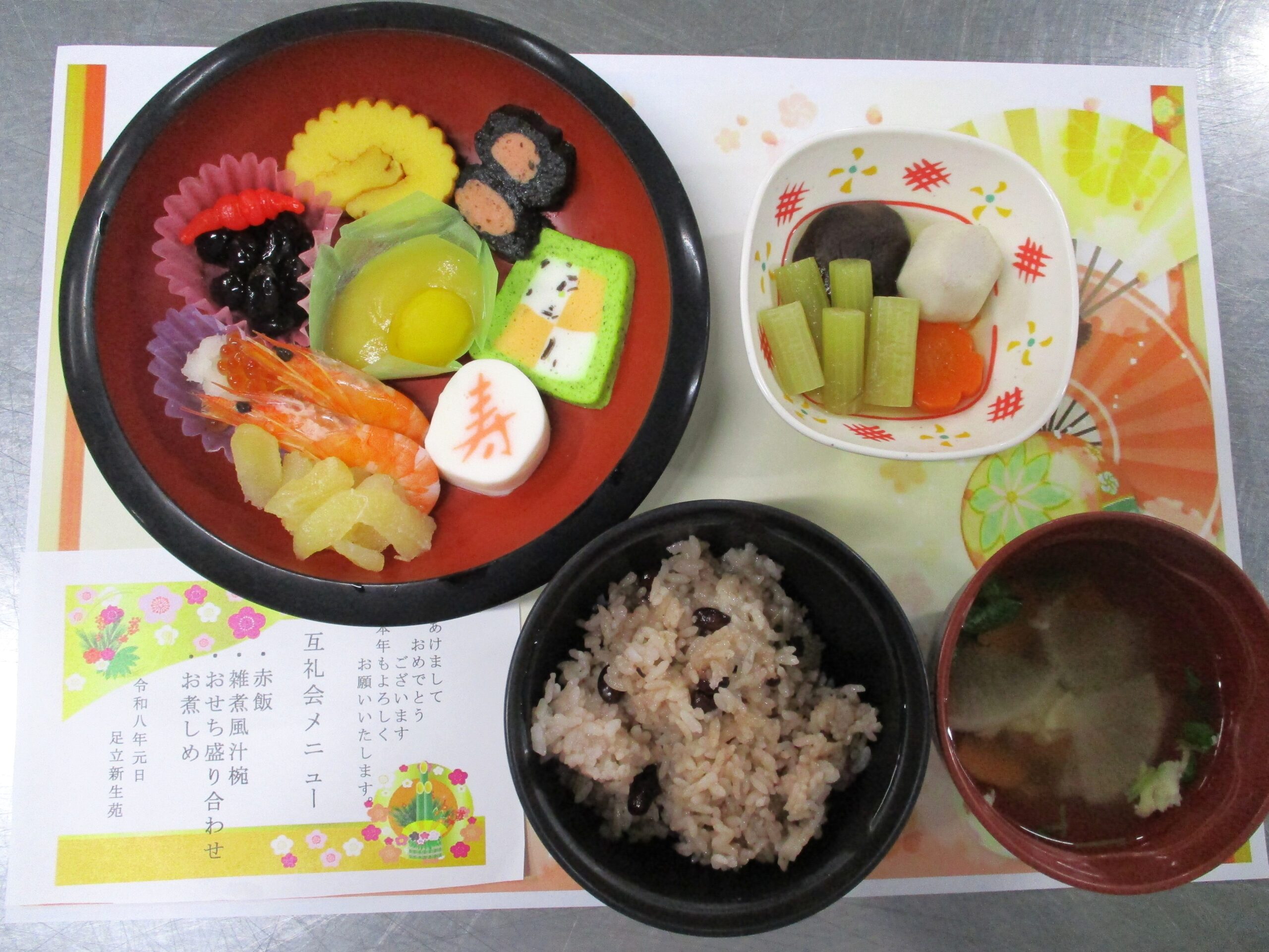 新年を祝う行事食として、目でも楽しめるようにお正月らしい彩り豊かな献立にしました。